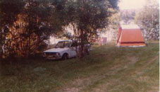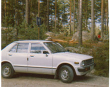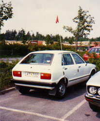 Var liten, vit och skuttig, så döpte en tjej bilen till "Lille Skutt" och så fick jag en Kanin mascot i present. Dagen efter när jag kom ut hängde kollegerna ut genom fönstret och jag fick snart veta varför. Någon hade tejpat fast en cykelflagga på dörren för bilen var så liten tyckte dom och vred sig av skratt. Jag med. I "Lille Skutt" for jag omkring mest själv. Ibland var mamma med. Vi åkte till skogarna och plockade svamp Hälsade på i Stockholm och tog vår Picknick korg och for till Dalarna som vanligt. Siljan runt var ett måste varje sommar. Sen återfick vi vår kära sommarstuga i ytterligare 4 år. Så dit gick färden full med packning och ungar. Bilen var en halvcombi. En sommar träffade jag en kille som hade två underbara schäferhundar som jag fraktade upp i min lilla bil. När jag skulle åka hem 27 mil från dem så la bilen av på E3:an. Där stod jag med ett tomt Batteri. |